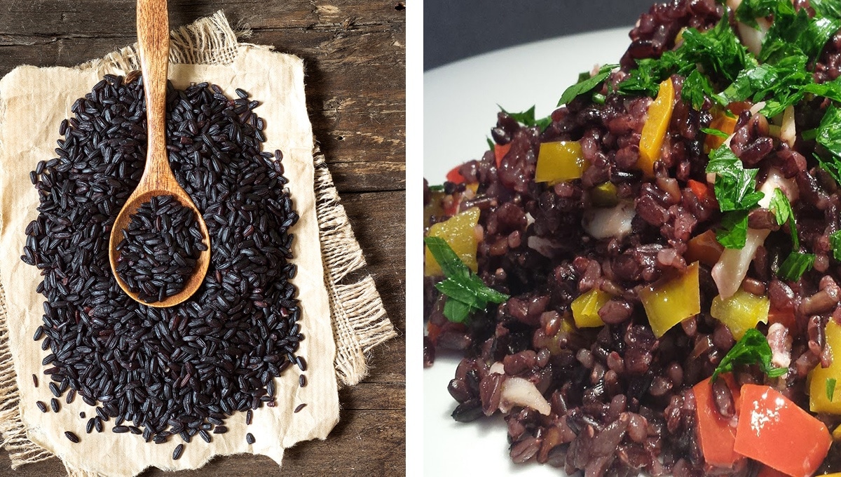 In questa ricetta proponiamo l’utilizzo del riso nero: questo tipologia di riso ha un alto contenuto in antiossidanti, chiamati antociani; è inoltre molto ricco di ferro, quindi indicato per le persone anemiche o donne in gravidanza. Ha inoltre un indiceglicemico più basso del riso bianco brillato e ha un altissimo contenuto di fibre, è adatto ai celiaci o agli intolleranti al glutine, ma anche a chi ha problemi di glicemia.